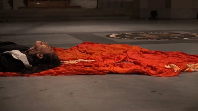 In 2016, the Cathedral of St. John-the-Divine invited Eiko to become an artist-in-residence. As such, Eiko is free to wander around, explore, experiment and perform throughout the vast Cathedral. This video finds Eiko in the Cathedral in an evening when it is closed to visitors. Starting with her visit to irradiated Fukushima in 2014, this red cloth has accompanied Eiko in almost all of her solo performances.